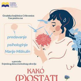 Gradska knjižnica Crikvenica poziva u povodu Svjetskog dana mentalnog zdravlja na predavanje psihologinje Marije Miškulin Kako (p)ostati mentalno zdrav koje će se održati u četvrtak, 9. listopada u Središnjem odjelu, Vinodolska 1. Predavanje počinje u 18 sati, a ulaz je slobodan. crikva.hr