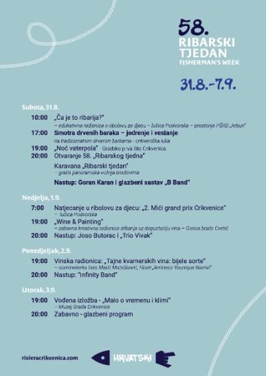 Odbrojavanje do početka mnogima najdražih tjedan dana na Rivijeri Crikvenica je počelo. Tjedan koji se gotovo 60 godina održava u čast crikveničkim ribarima i vrijednoj tradiciji ribarstva i ove će godine biti prepun zabavnih, kulturnih, sportsko-rekreativnih, gastronomskih i ostalih uzbudljivih događanja. 58. „Ribarski tjedan“, dio brenda „Kvarner Maritime Heritage“, kojim se promovira pomorska baština Kvarnera, počinje 31. kolovoza, a traje do 7. rujna.