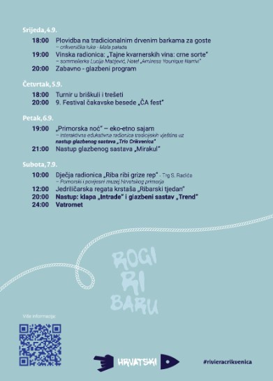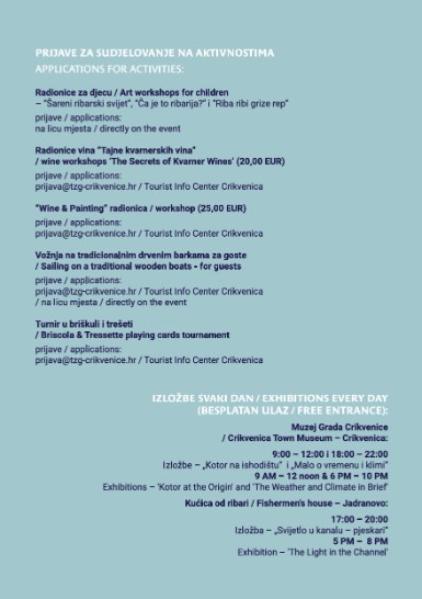 Program počinje u subotu, 31. kolovoza, dječjom radionicom „Ča je to ribarija?“ ispred prostorija PŠRD „Arbun“ u lučici Podvorska. Bogata će pomorska tradicija biti predstavljena u popodnevnim satima Smotrom drvenih barki (jedrenje od 17:00 i veslanje od 18:30 sati) koja kreće iz crikveničke luke, a osim lokalnih barki sudjelovat će i jedriličari s Krka, iz Lovrana, kao i slovenski jedriličari.
