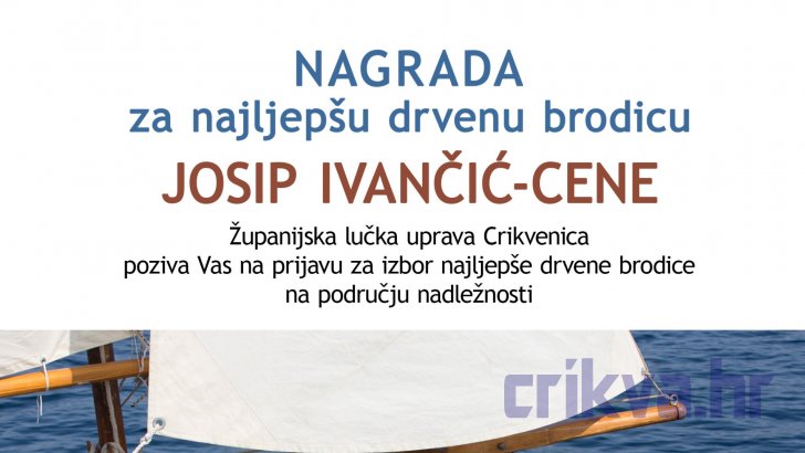Županijska lučka uprava Crikvenica poziva Vas na prijavu za izbor najljepše drvene brodice na području nadležnosti. Nagrada Josip (Joško) Ivančić Cene nosi naziv po najistaknutijem brodograditelju crikveničkog kraja koji je u svojoj radionici proizveo više od 50 plovila od kojih mnoga i danas krase crikveničke luke i razna druga mjesta na Jadranu.