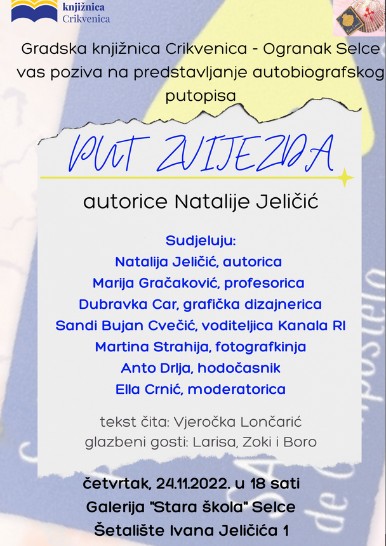 U četvrtak 24.11. u Galeriji “Stara škola” u Selcu s početkom u 18 sati bit će predstavljen autobiografski putopis “Put zvijezda 1” i “Put zvijezda 2” autorice Selčanke Natalije Jeličić.