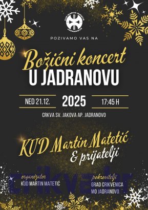 Tradicionalni Božićni koncert KUD-a "Martin Matetić" održat će se u nedjelju od 17:45 h u crkvi Sv. Jakova u Jadranovu Uz domaćine, mješoviti pjevački zbor "Martin Matetić" i klapu "Sveti Jakov" nastupaju jos i klapa "Sveta Jelena" Dramalj te zbor "Vrelo" Fužine.