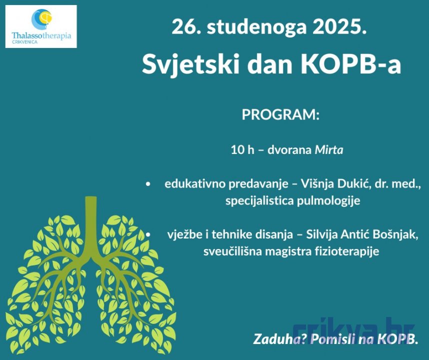 Osvijestimo zajedno ozbiljnost KOPB-a, kronične bolesti koja mijenja svakidašnjicu milijuna ljudi diljem svijeta - pridružite nam se u srijedu, 26. studenoga u Thalassotherapiji Crikvenica!