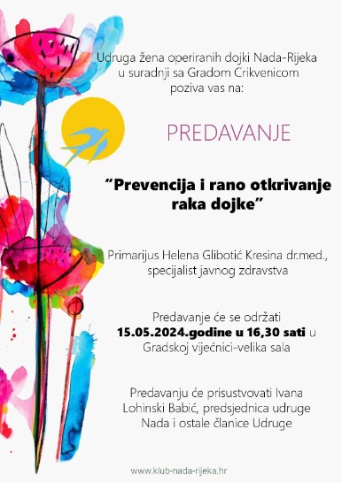 Udruga žena operiranih dojki “Nada” Rijeka, u suradnji s Gradom Crikvenica, poziva sve zainteresirane na predavanje pod nazivom “Prevencija i rano otkrivanje raka dojke”.