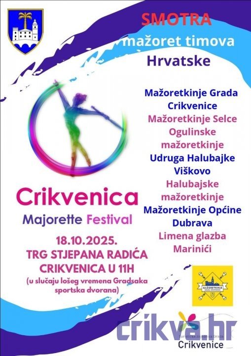Smotra mažoret timova Hrvatske održat će se u subotu, 18. listopada 2025. godine, s početkom u 11 sati od hotela Miramare prema Trgu Stjepana Radića. Ovaj događaj okupit će mažoret timove iz cijele Hrvatske, koji će svojim nastupima oduševiti sve prisutne. Mažoretkinje Grada Crikvenice, Mažoretkinje Selce, Ogulinske Mažoretkinje, Udruga Halubajke Viškovo, Halubajske mažoretkinje, Mažoretkinje Općine Dubrava te Limena glazba Marinići zvijezde su nadolazeće subote.
