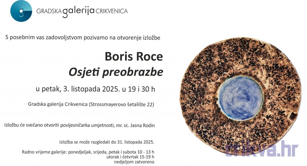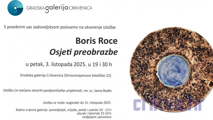 Večeras će, s početkom u 19:30 sati, u Gradskoj galeriji Crikvenica (Strossmayerovo šetalište 21) biti otvorena izložba "Osjeti preobrazbe" autora Borisa Roce.